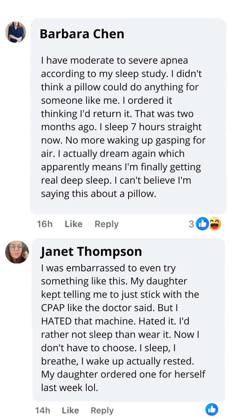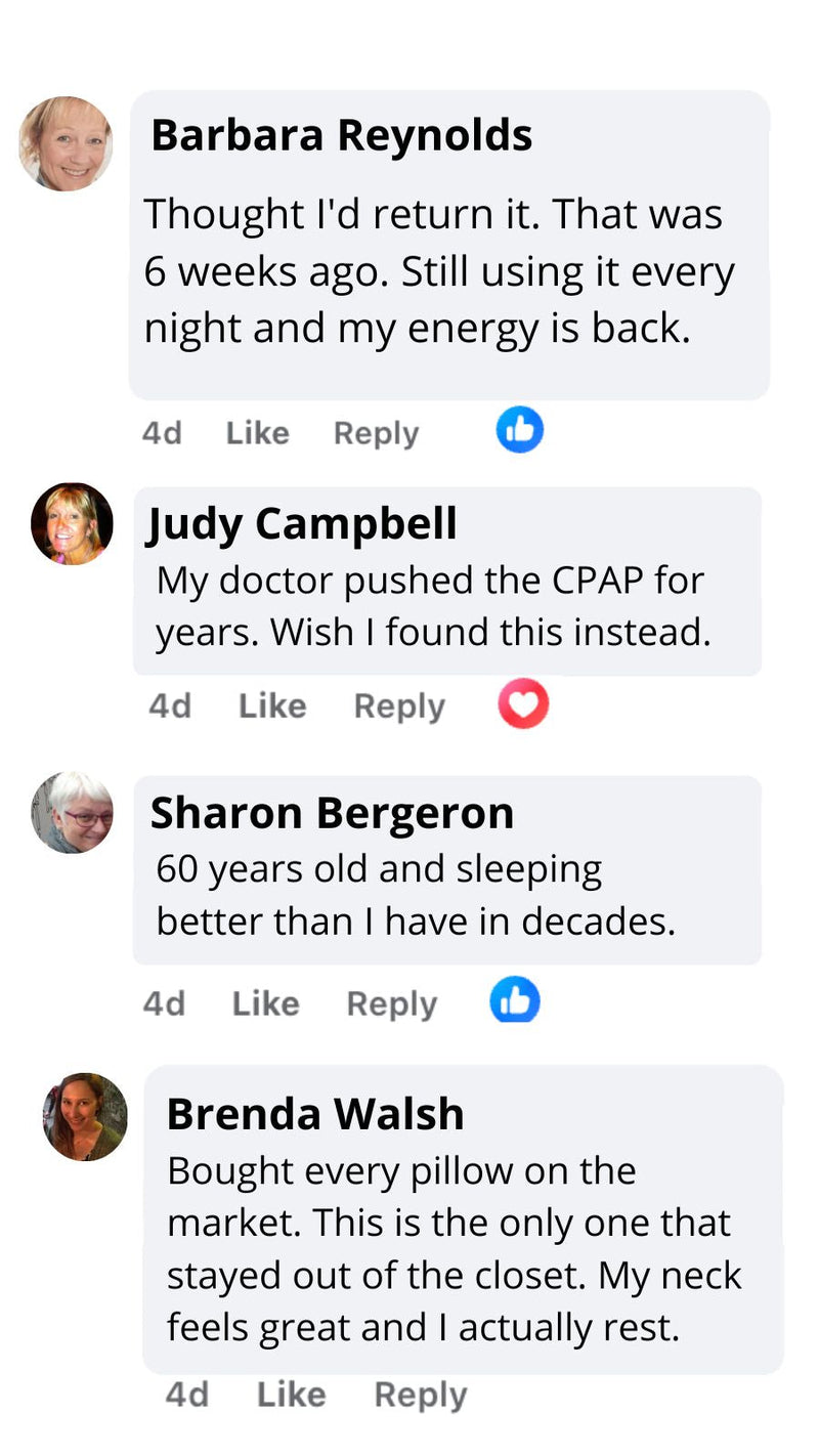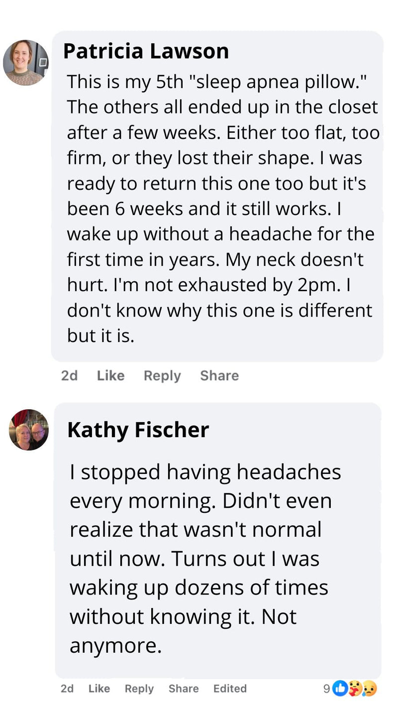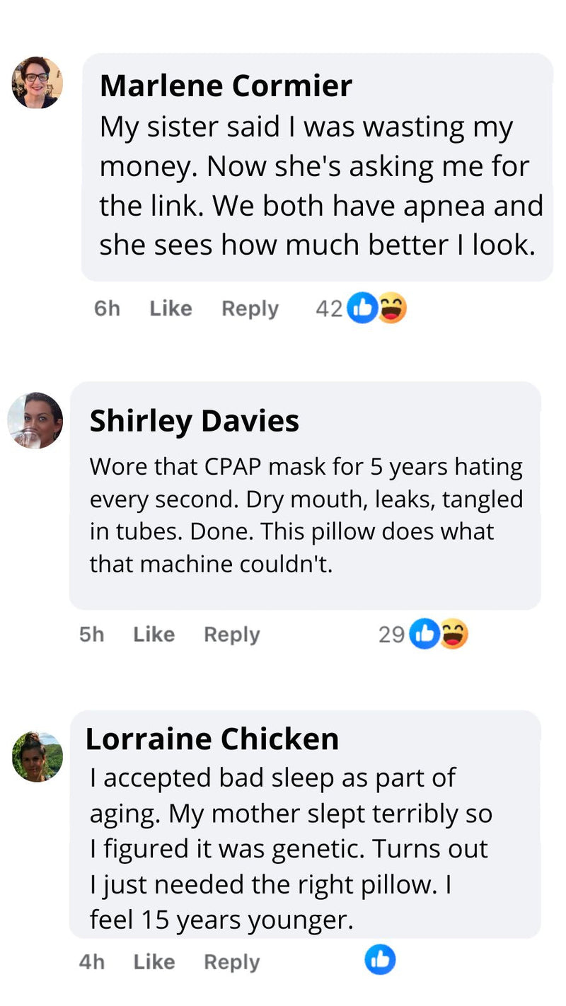 "I Didn't Think a Pillow Could Replace My CPAP""How could a pillow do what a medical machine couldn't? I almost didn't order. But I was desperate — sick of waking up with mask marks and still looking exhausted. The difference in my face says it all. No more dark circles. No more puffiness. I actually look rested because I finally AM rested."— Karen T.