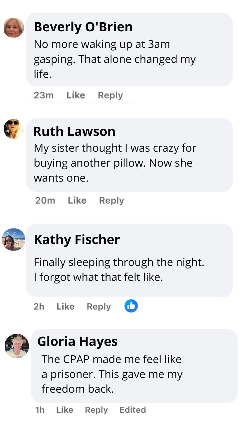 "I Thought My Case Was Too Severe" "I told myself nothing would work for me — my sleep apnea was too bad. I'd tried 2 different CPAPs and woke up every morning looking like I hadn't slept in days. Dark circles, puffy face, exhausted. Three weeks with this pillow and my husband asked what I was doing differently. Look at my eyes now. That's all the proof I need."— Rebecca M.